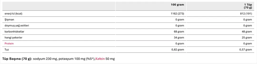 Maltodekstrin, su, sukroz, glikoz şurubu, izomaltuloz*, mumlu mısır nişastası, sodyum klorür, potasyum fosfat, asitlen sitrik asit, tatlandırıcılar (kafein dahil).