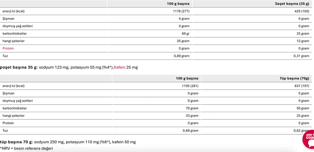 tüp: Maltodekstrin, su, sukroz, glikoz şurubu, izomaltuloz*, mumlu mısır nişastası, sodyum klorür, potasyum fosfat, sodyum sitrat, asitleyici sitrik asit,kafein